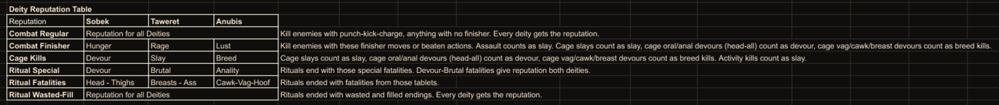 - Rage / Lust / Hunger finishers in combat: 1× reputation.